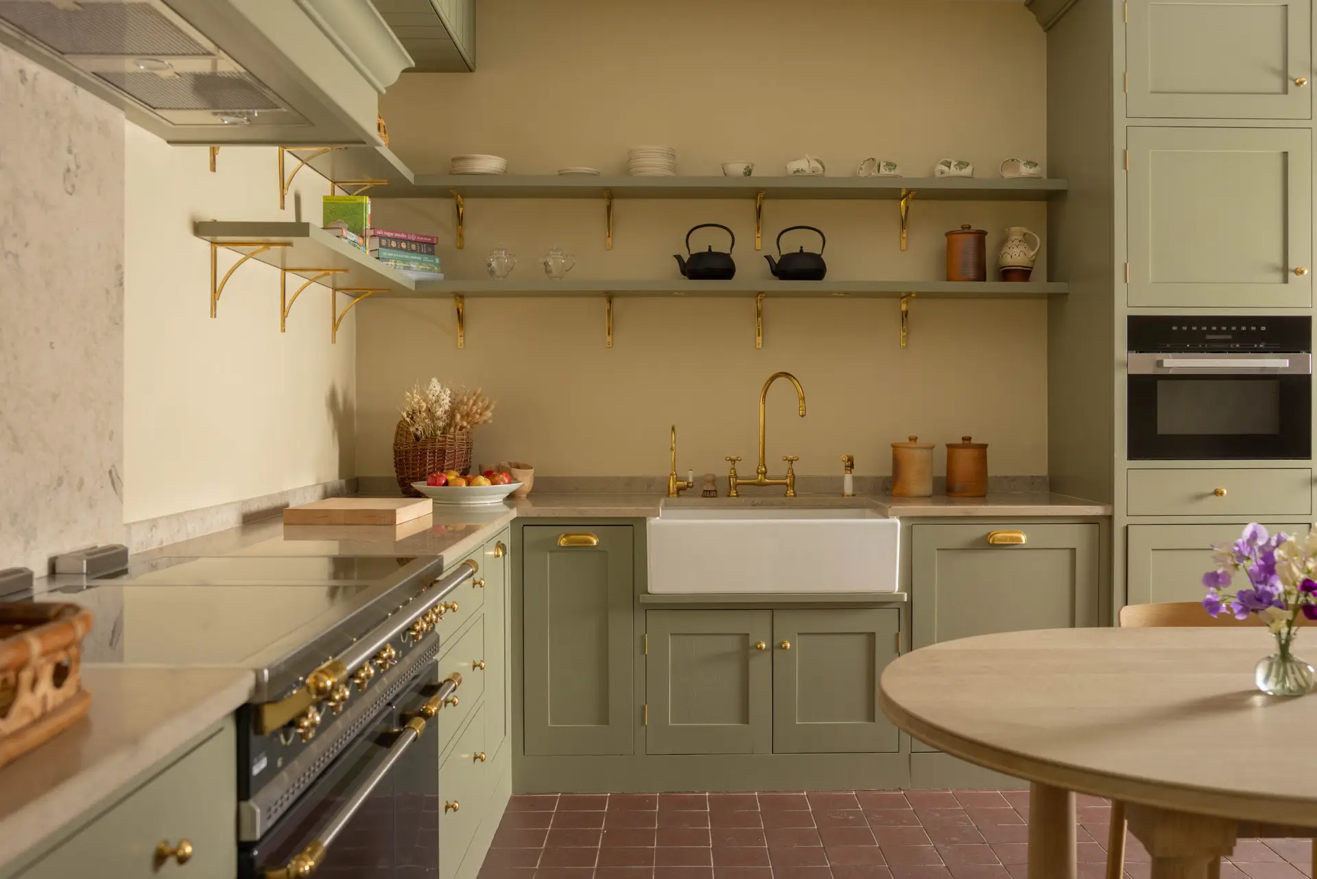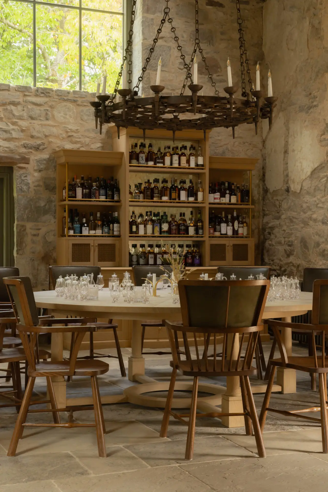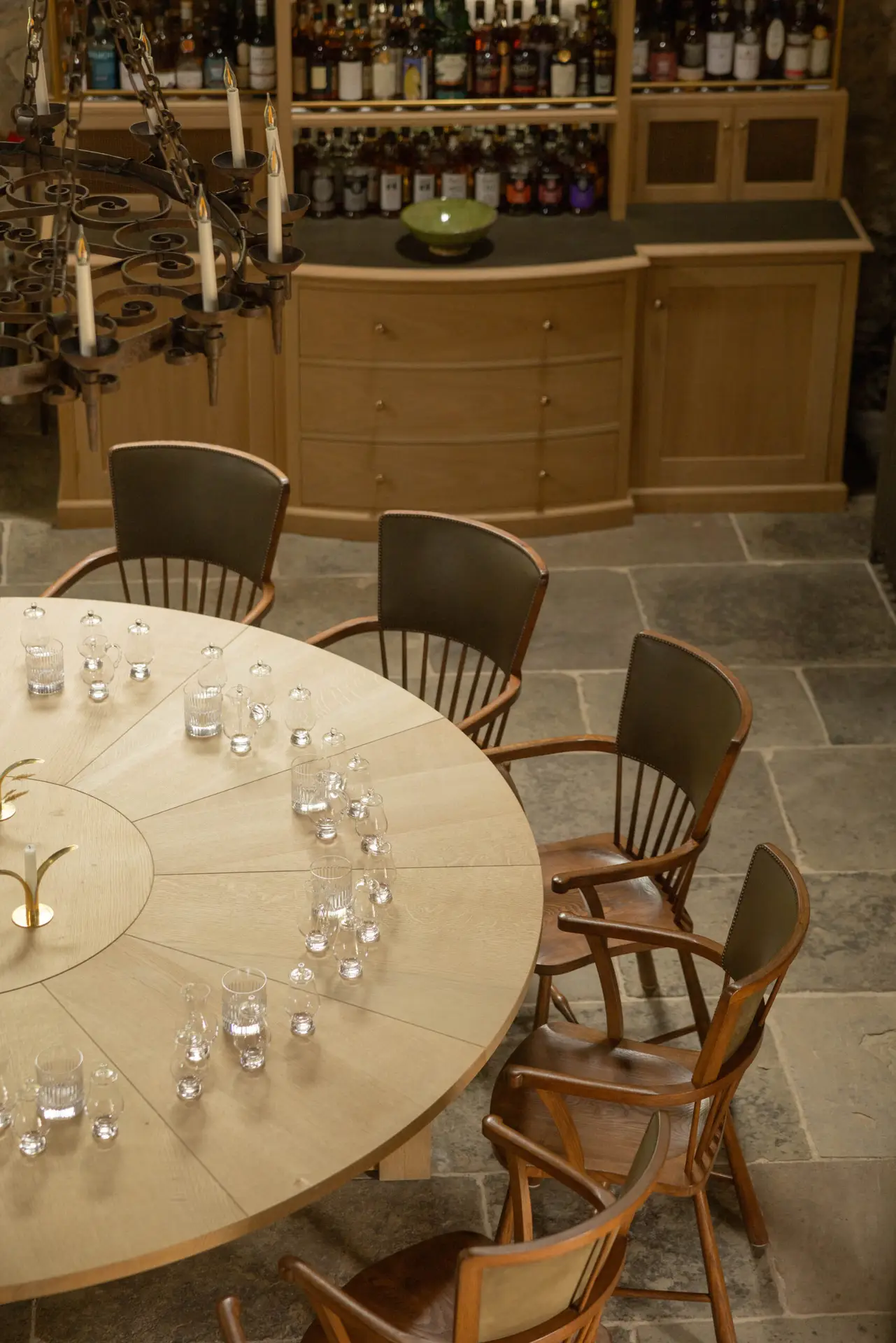 Within the castle steading, this brief resulted in a set of large oak tables, two built-in bars, a suite of other built-in cabinetry, and custom built-in sofas with pleasing hidden details. We also collaborated with Wildland to create two large kitchens – one for guests to enjoy at their leisure in a quite in-frame shaker style, the other for the castle team to use to cater large events (without compromising on design detail).
