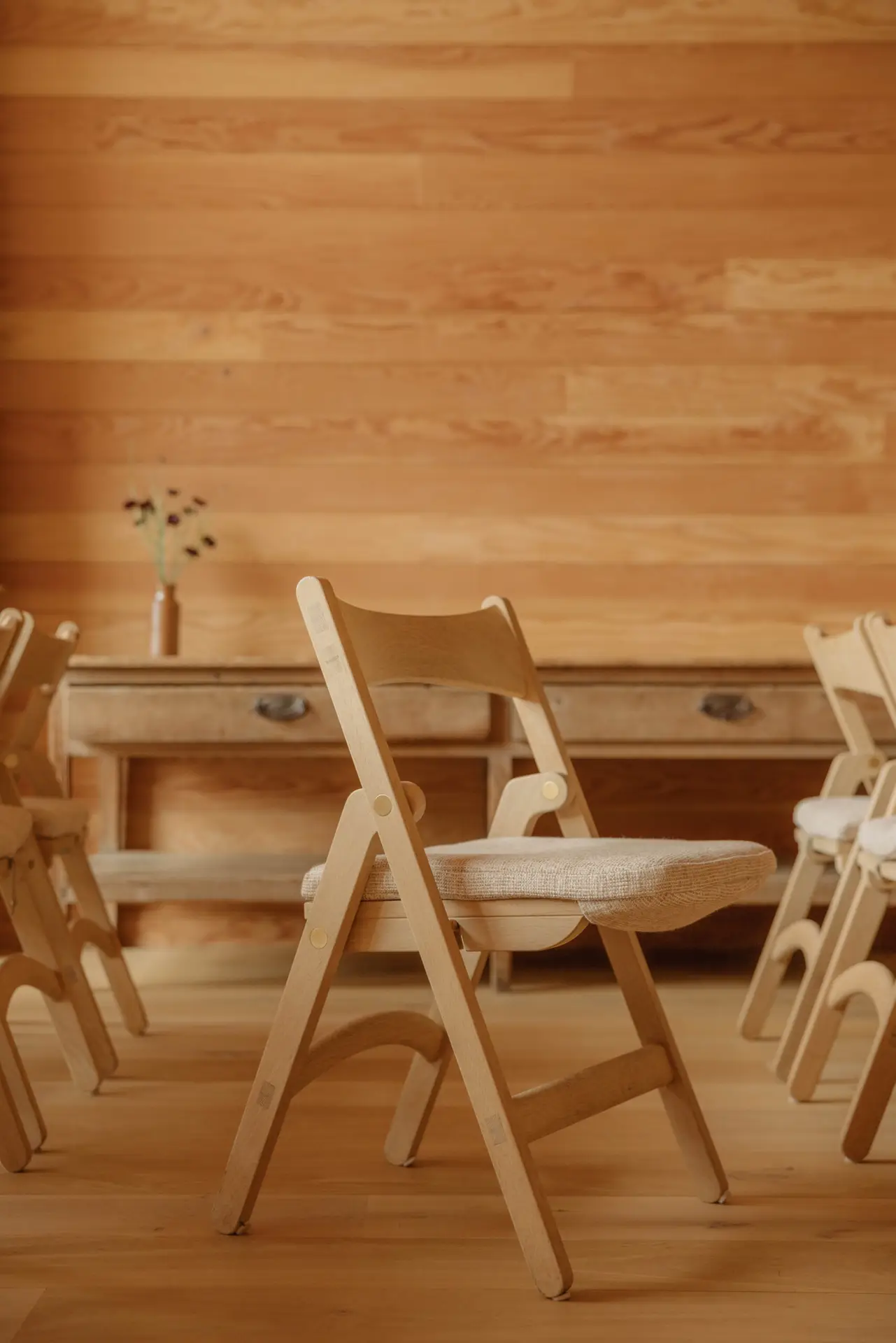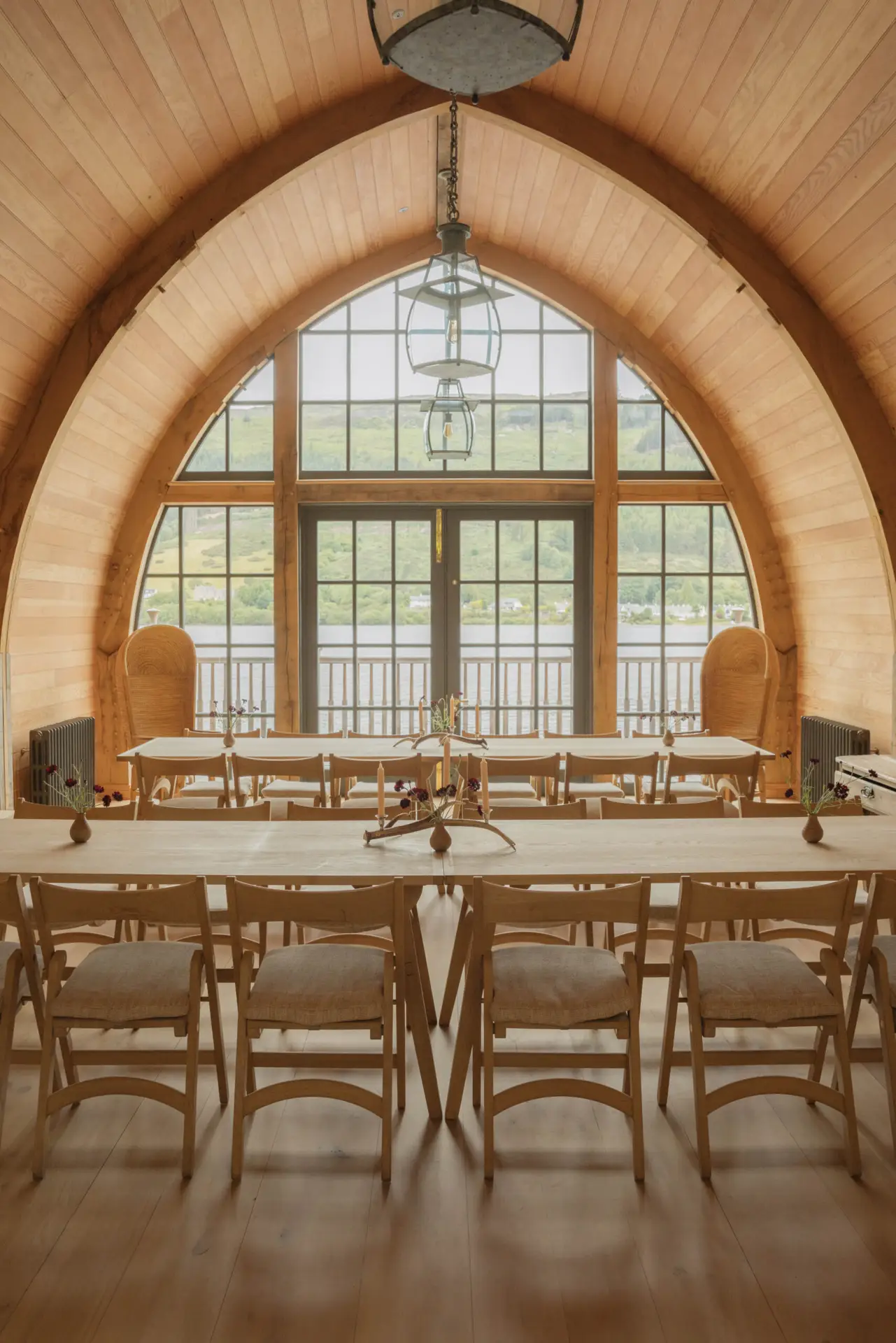 Adjacent to the castle, sitting proudly on Loch Ness, the Aldourie boat house is a second venue with multiple uses. From long, lazy lunches to quiet yoga practices, the boat house needed a very particular set of furniture that could be deployed in a much smaller space, without compromising the design language throughout the rest of the estate. Working with Wildland, we created a collection of oak folding chairs and matching tables. These have a smaller footprint than our creations in the steading, but echo their tactility and celebration of material.