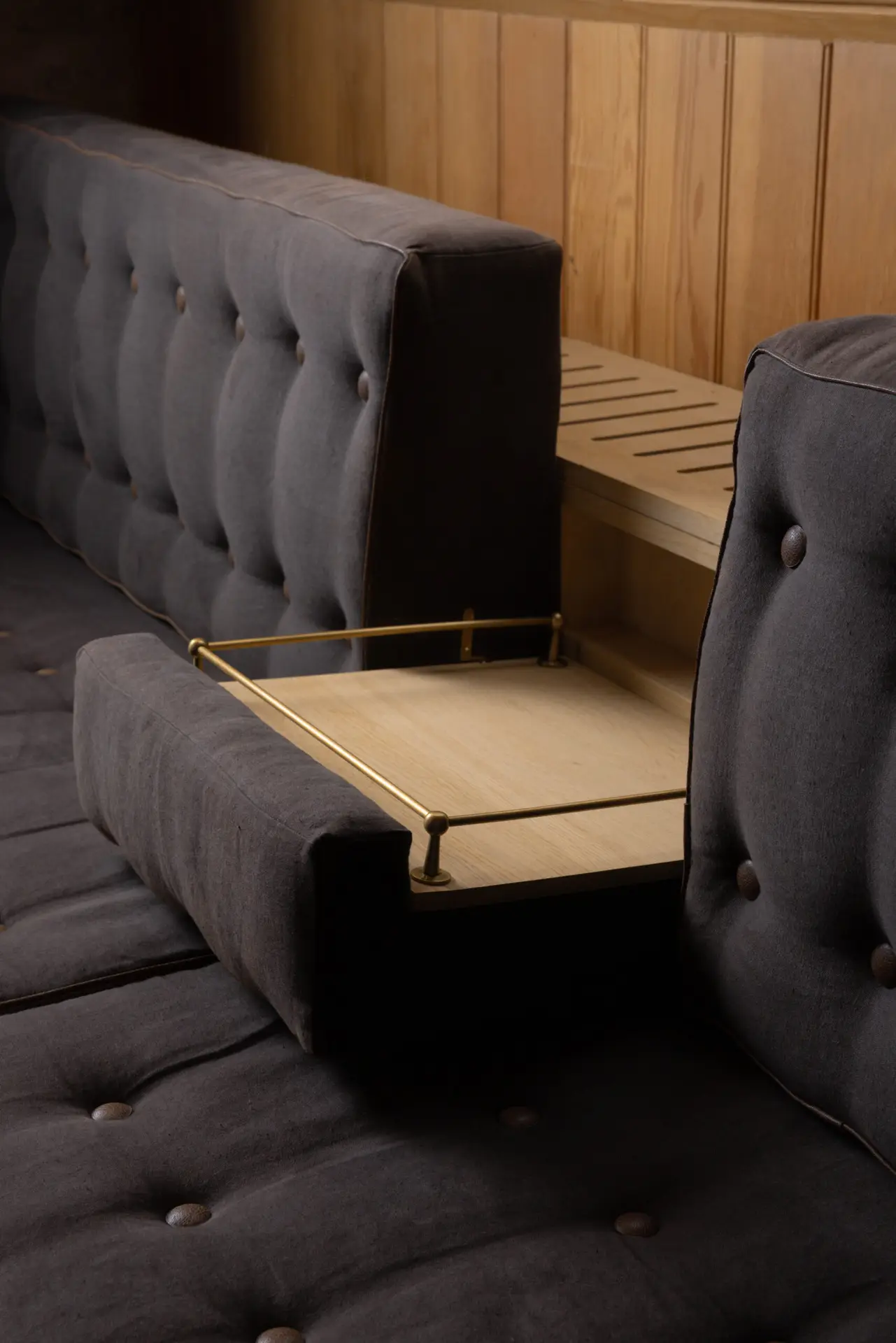 Simple shapes, clean cuts, and seamless construction were the watchwords of this brief. While the forms veer towards the traditional, the pieces have all been created with modern comfort in mind. Details such as hidden veneered switches in the built-in cabinetry allow for uninterrupted enjoyment of the space without compromising on the operation of the venue.