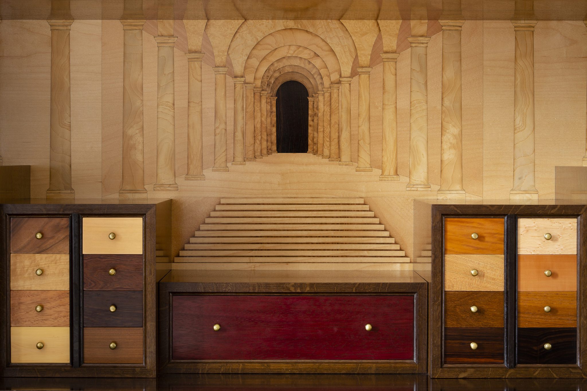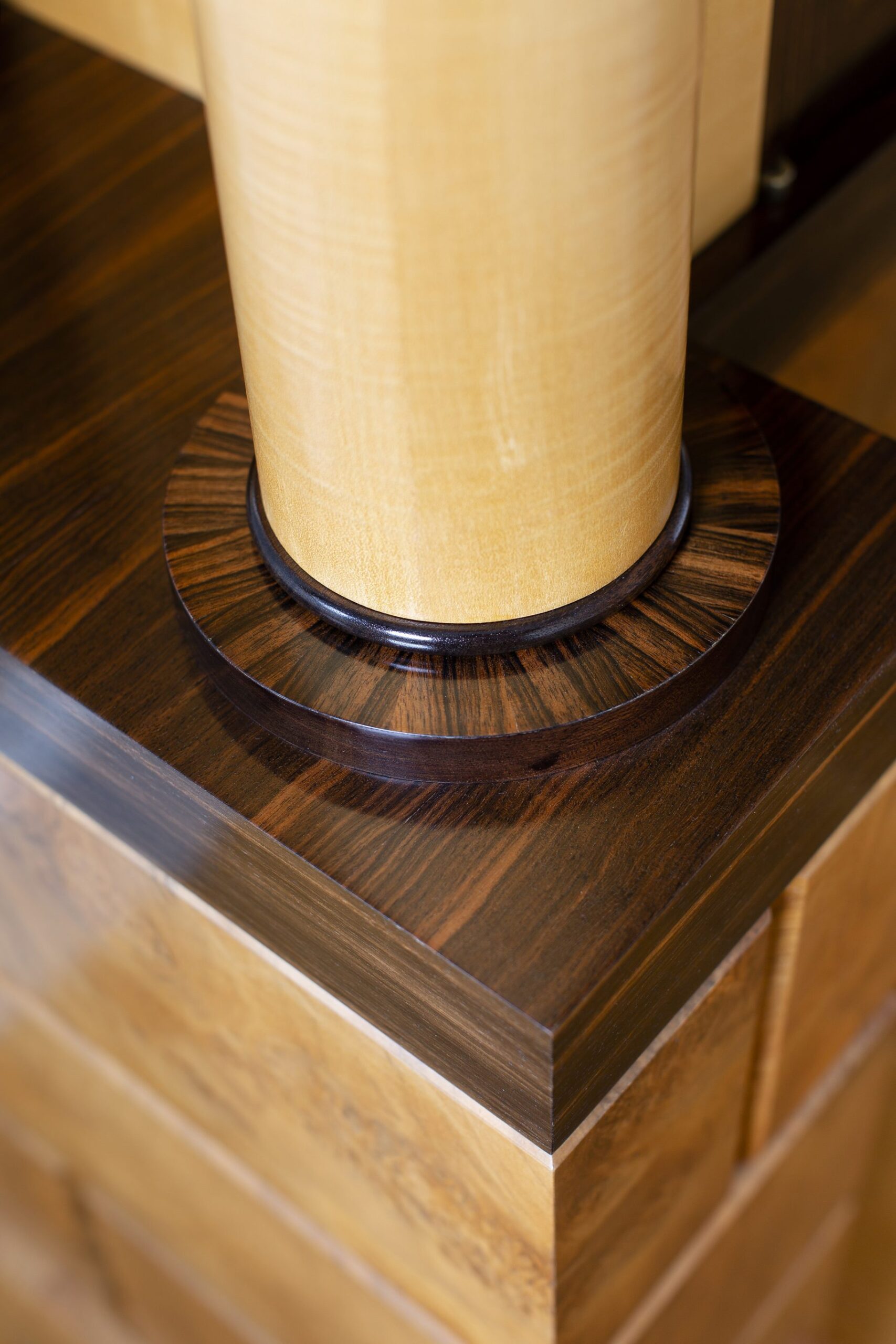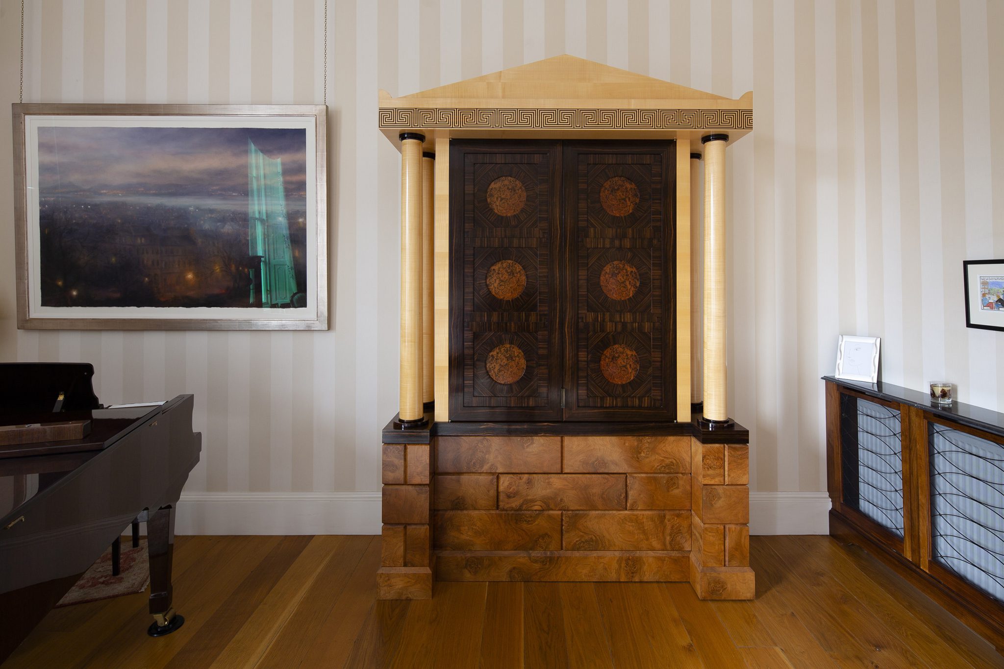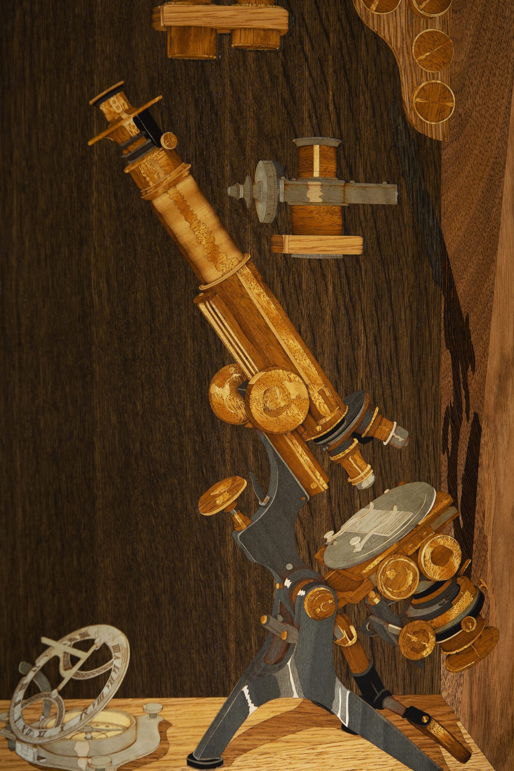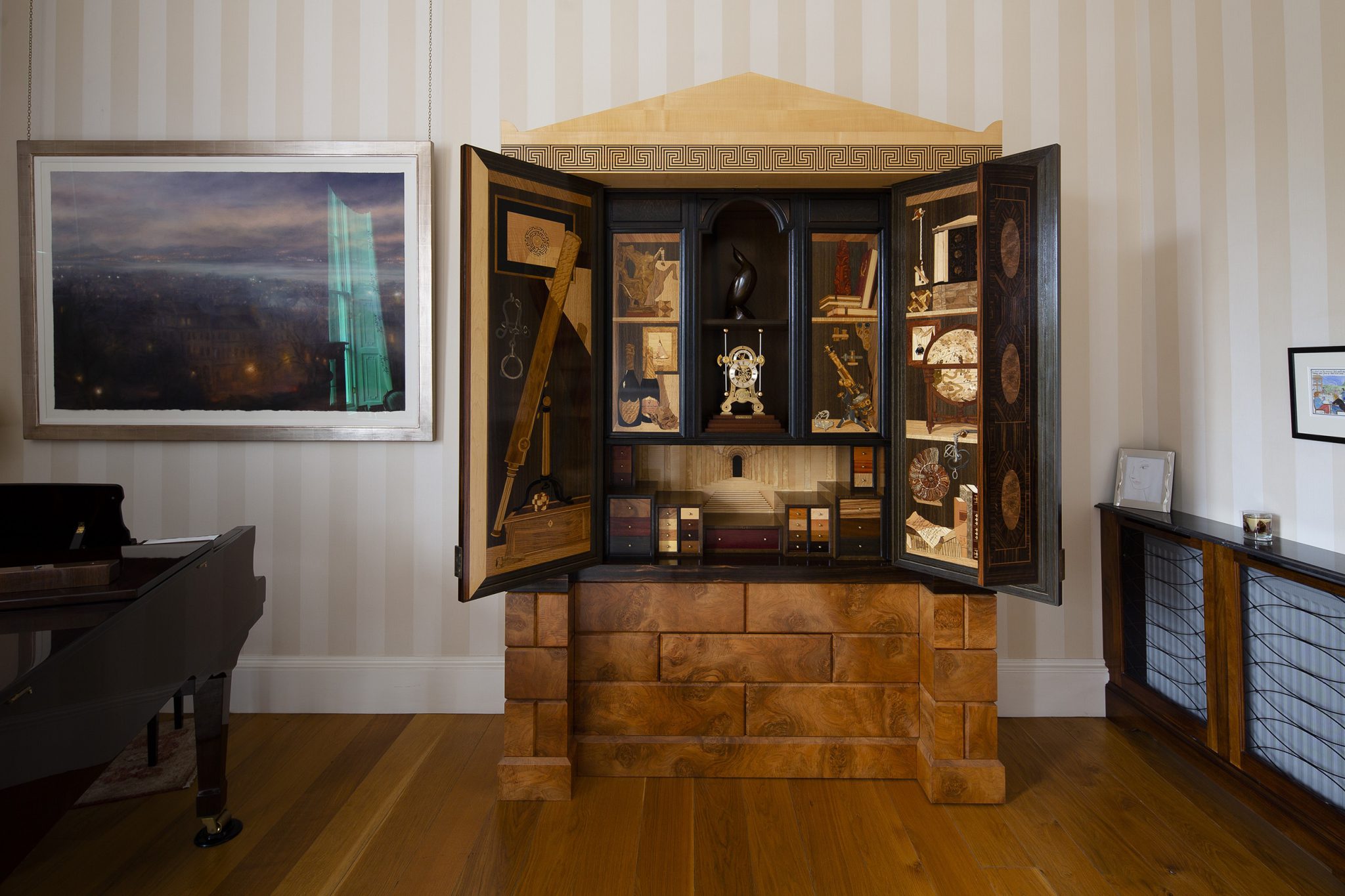 This piece was a unique commission to commemorate a year of special birthdays for our clients. The incredible marquetry detailing features over 100 different wood veneers, each evocative design signifying the owner’s mutual interests and passions.  The finely engineered components such as pocket doors and secret compartments make this a treasure trove of surprises.  This exquisite piece demonstrates fine cabinet making techniques at its very best.
